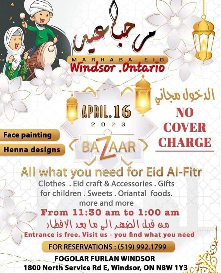 Visit the Eid Market Bazaar. Face painting, Henna designs, clothes, gifts, delicious sweets and much more will be available. Taking place on April 16th at Fogolar hall at 1800 North Service Road East in Windsor. Free entry for everyone. From 11:30 am to 1 am before suhoor, you are all welcome.