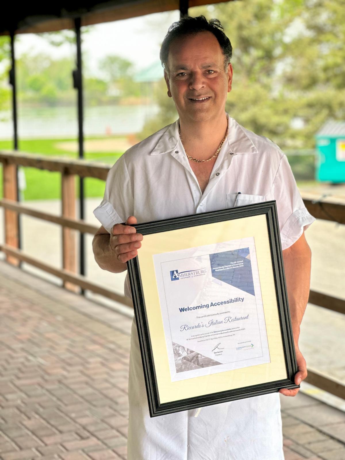 Riccardo's Italian Restaurant received the Welcoming Accessibility Award last week at the Amherstburg Chamber of Commerce's 18th Annual Business Excellence Awards. This award was presented by Community Living Essex County. Congratulations to Riccardo's!