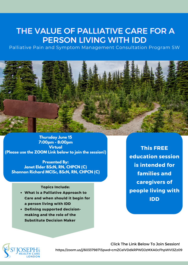"The Value of Palliative Care for a Person Living with IDD" will be taking place June 15th at 7pm and will be presented by esteemed healthcare professionals Janet Elder BScN, RN, CHPCN (C) and Shannon Richard MClSc, BScN, RN, CHPCN (C).