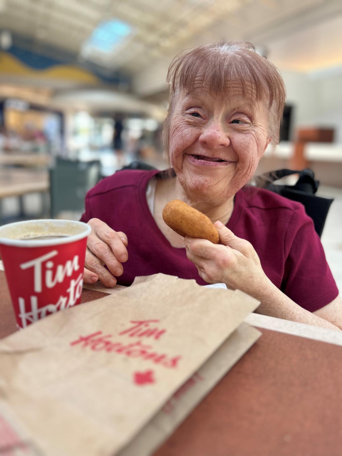 Betty couldn't help but smile while indulging in some well known Canadian treats from Tim Hortons. She took a break from shopping at Tecumseh Mall for a warm sip, a sweet treat, and it made for a perfect afternoon.