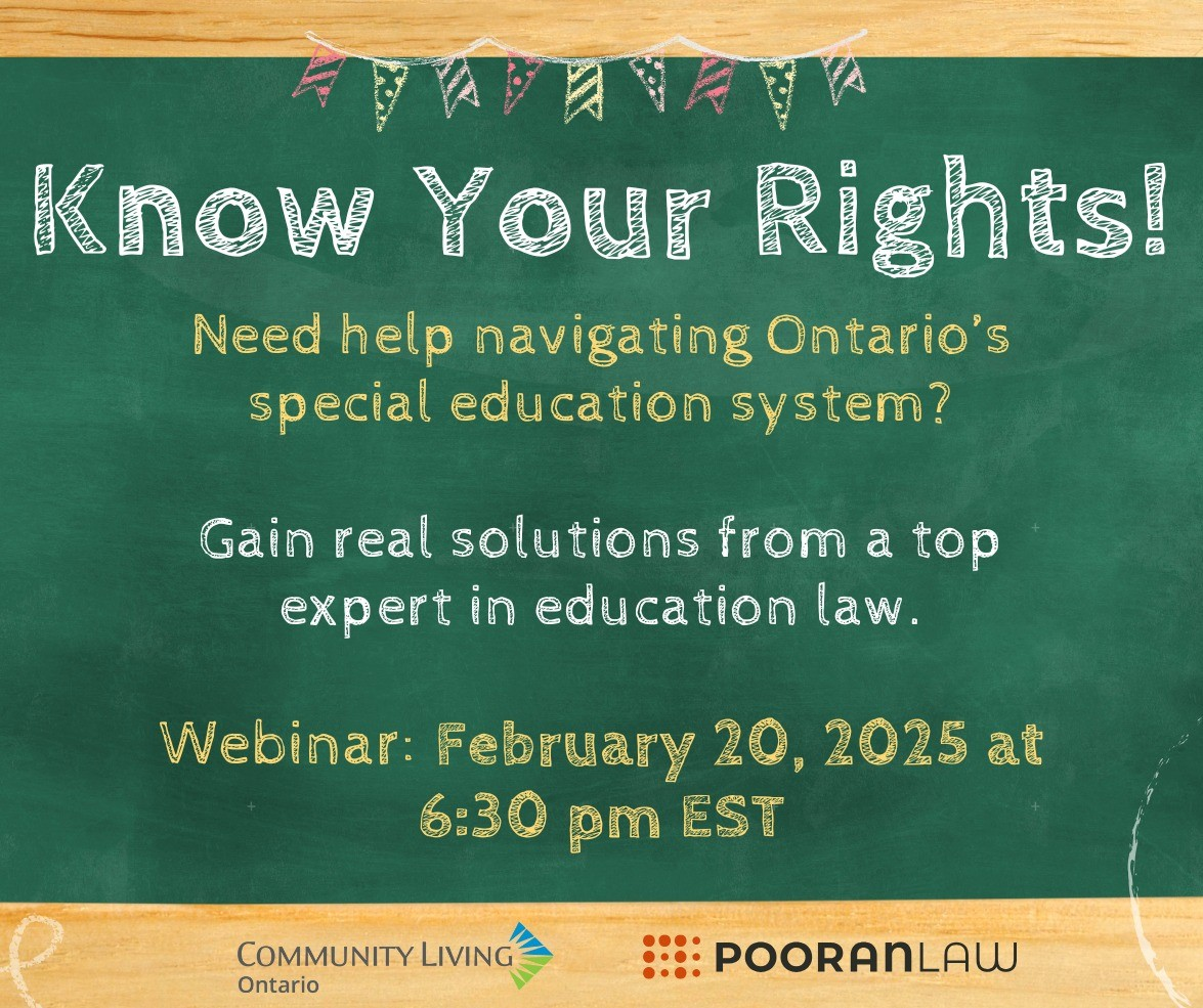 On February 20 at 6:30 pm EST, Community Living Ontario will host an informative online webinar for parents and guardians navigating Ontario's special education system. An expert in educational law from PooranLaw Professional Corporation will guide participants through their rights and their child’s rights, addressing key concerns and questions. This valuable session aims to empower families with the knowledge they need to better navigate the complexities of the special education system, ensuring they understand their rights and are equipped with the tools to advocate effectively for their child's educational needs. Click the button below to register for the event. | |