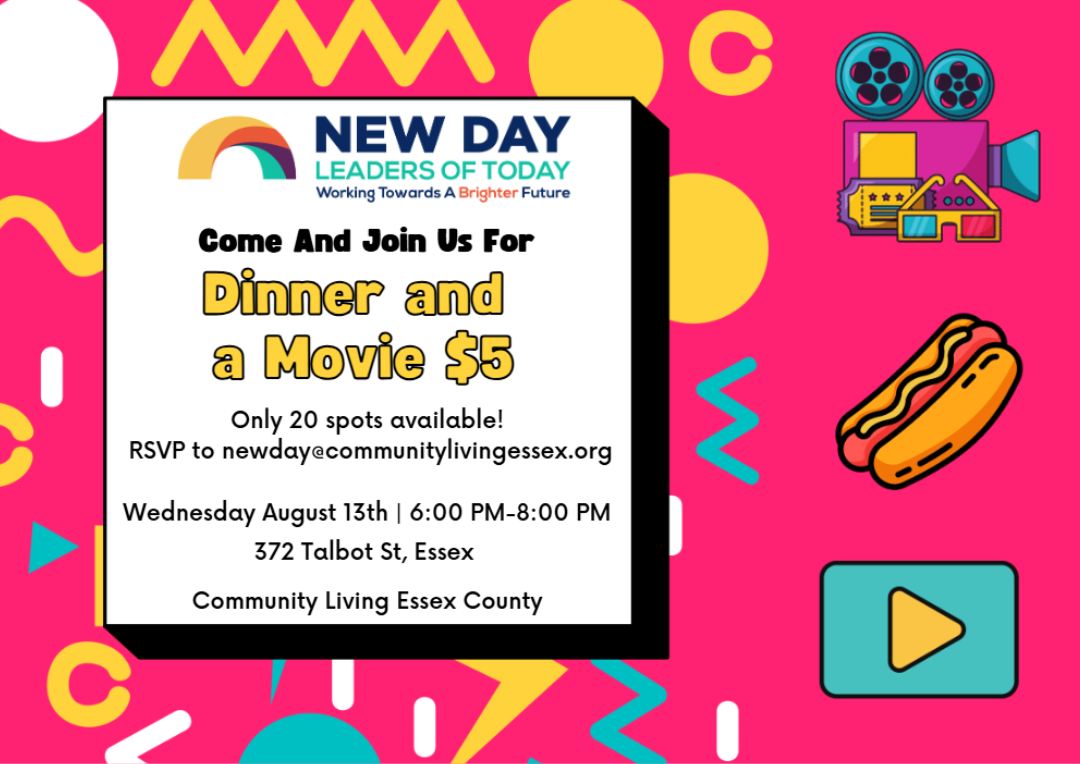 New Day – Leaders of Today invites you to an exciting evening of Dinner and a Movie for just $5 on Wednesday, August 13th from 6:00 p.m. to 8:00 p.m. at 372 Talbot St, Essex. Enjoy a delicious dinner and a classic film in great company! Only 20 spots are available, so be sure to RSVP soon by emailing newday@communitylivingessex.org.