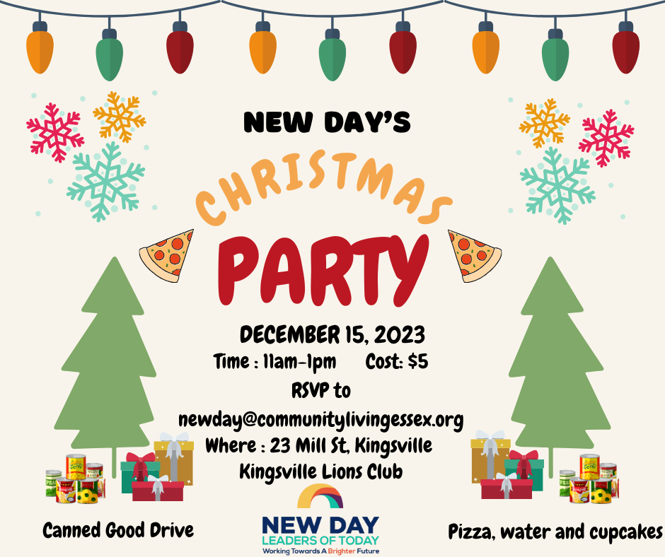New Day is having a Christmas Party on December 15th, from 11 am - 1 pm at the Kingsville Lions Club. The cost is $5 to attend, and this includes pizza, water and cupcakes. We will also be collecting canned goods to donate to a local food bank. Wear your festive outfits and be ready to play some games and have some fun!