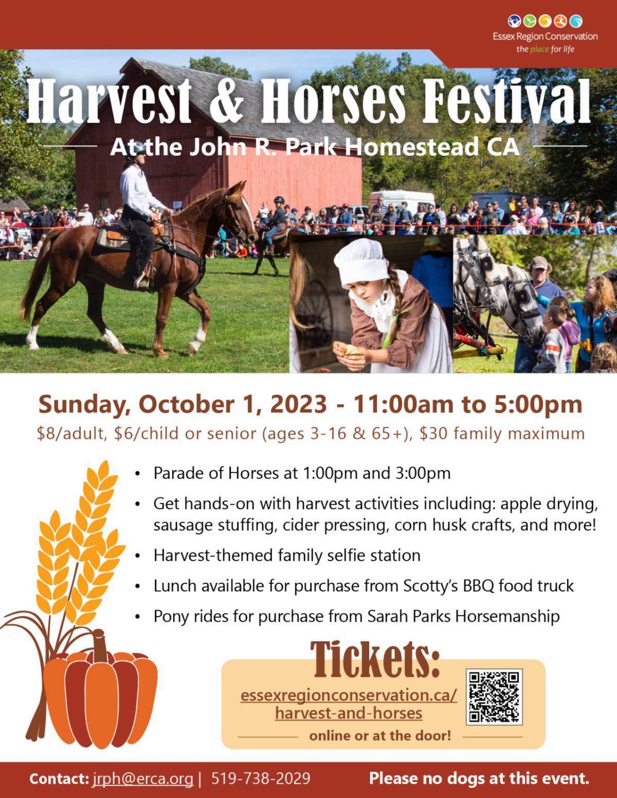 The Harvest and Horses Festival at the John R. Park Homestead is on Sunday, October 1st, from 11 am to 5 pm. Admission is $8 for adults, $6 for children or seniors (ages 3-16 & 65+), and $30 for families. Register online or at the door. Dogs are not allowed at this event. Don't miss this fun-filled day at the John R. Park Homestead in Essex.