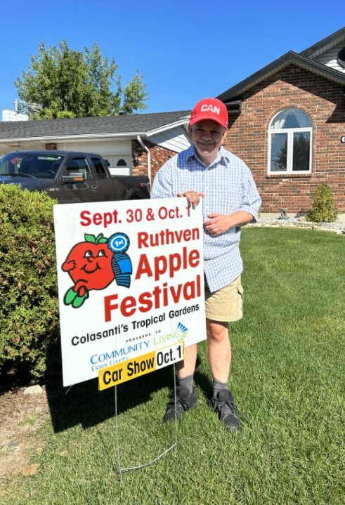 Folks throughout Windsor-Essex County have been gearing up for the much loved Ruthven Apple Festival! Pictured above is Brianna, Clayton, and Kevin. Pictured below is Ryan and Lori. They are all proudly displaying their Ruthven Apple Festival signs, inviting their neighbours and friends to join them for some wonderful autumn activities for a worthy cause. All proceeds go toward the maintenance and purchase of accessible vehicles for Community Living Essex County. The festival is scheduled for September 30th and October 1st at Colasanti's Tropical Gardens and we are looking forward to seeing you all there!