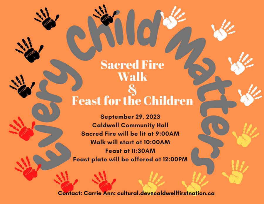 Caldwell First Nation invites you to commemorate the National Day for Truth and Reconciliation through their Every Child Matters Sacred Fire events. On Friday, September 29th, there will be a Sacred Fire Walk and Feast for the Children at Caldwell First Nation's hall in Leamington, starting at 9 am. On Saturday, September 30th, Caldwell First Nation will host the Sacred Fire for the Children at Northwest Beach in Point Pelee National Park, also starting at 9 am. Stand in solidarity as we honour this important day together. For additional details, please contact Carrie Ann at cultural.dev@caldwellfirstnation.ca