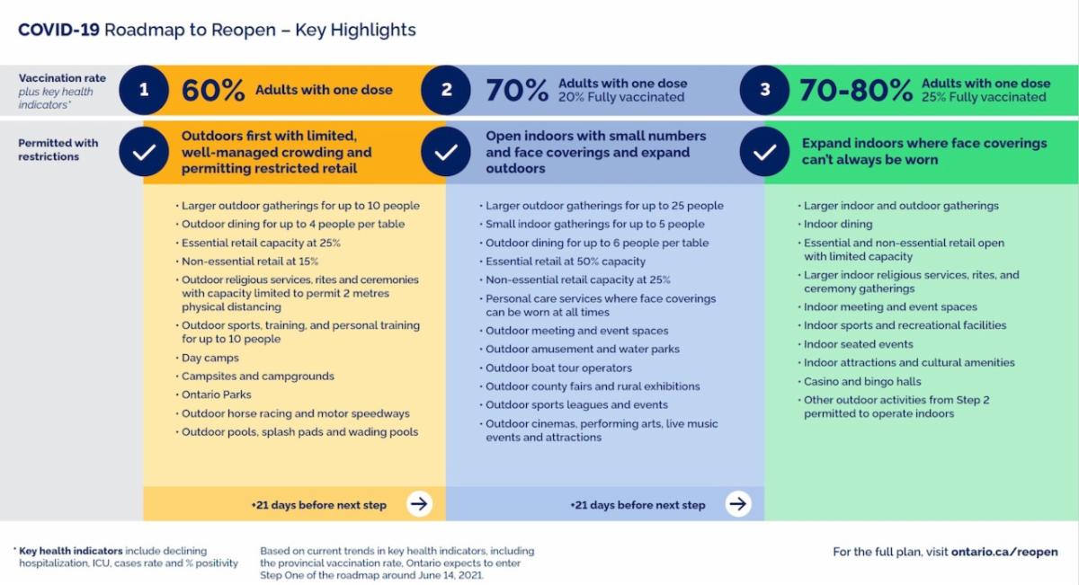 Effective June 30th, Ontario is now in Stage 2 of the Roadmap to Reopen. In order to move into Step 2 the province set a vaccination target of 70 per cent of adults with one dose and 20 per cent fully vaccinated.