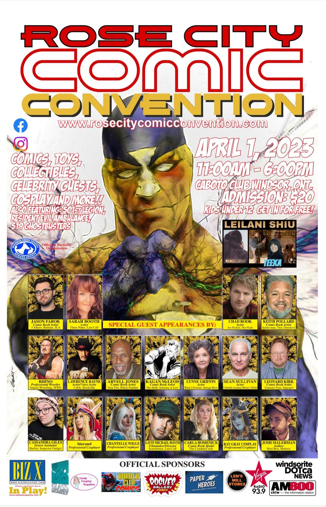 The Rose City Comic Convention hits Windsor on Saturday April 1st at Caboto Club! Meet stars of TV, film, comic books, animation and pro wrestling.