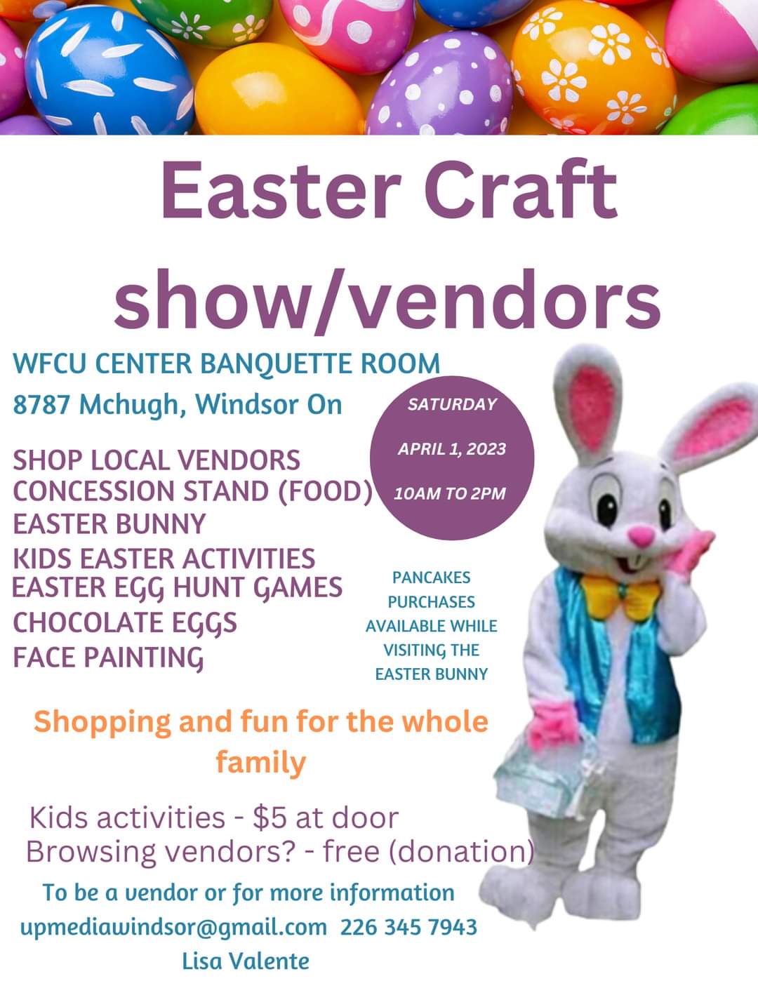 Kids activities are $5 per family. For more information contact Lisa at 226-345-7943. This event is taking place at the WFCU Centre, 8787 McHugh Street in Windsor on Saturday from 10:00am-2:00pm.