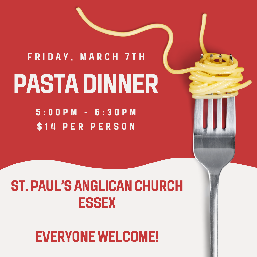 St. Paul's Anglican Church in Essex invites you to a pasta dinner on Friday, March 7th, from 5:00 p.m. to 6:30 p.m. The meal includes pasta, salad, a roll, a beverage, and dessert, with takeout available. Meatless pasta option is available. The cost is $14 per person. Enjoy great food and fellowship while supporting the many ministries of St. Paul's, including the Clothing Cupboard, Fun with Flags, Diverse and Creative Worship, and more. Click the button below to visit the event website. | |