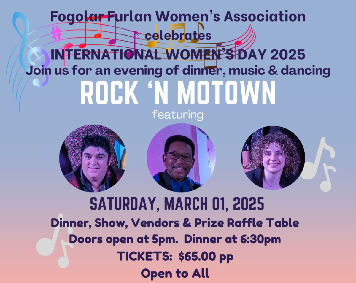 The Fogolar Furlan Women’s Association celebrates International Women’s Day: Rock ‘N Motown on Saturday, March 1st, at the Fogolar Furlan Club in Windsor. The event kicks off at 5:00 p.m. with local vendors and raffle ticket sales, followed by dinner at 6:30 p.m. for $65 per person, which includes both dinner and the show. Musical performances will begin at 8:00 p.m. Tickets for the show-only are available for $40, with doors opening at 7:30 p.m. Proceeds from the event benefit Sleep in Heavenly Peace, Windsor Chapter. For tickets and more information, contact the Fogolar Furlan Club or click the button below to visit the event website. | |