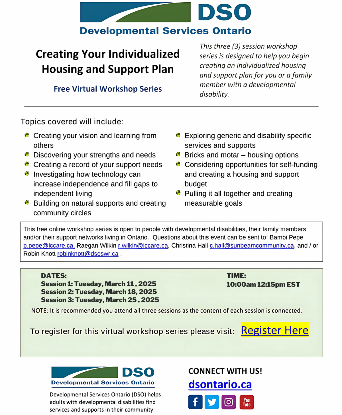 The "Creating Your Individualized Housing and Support Plan" workshop series is a three-session virtual program designed to help individuals and families begin developing a personalized housing and support plan for those with a developmental disability. The sessions will take place on three consecutive Tuesdays, starting March 11th, with additional sessions on March 18th and March 25th, each session starting at 10:00 a.m. to 12:15 p.m. This workshop series offers valuable guidance on navigating housing options and identifying the necessary support services. Participants can register through the provided link and take the first step in planning for a supported future. | |