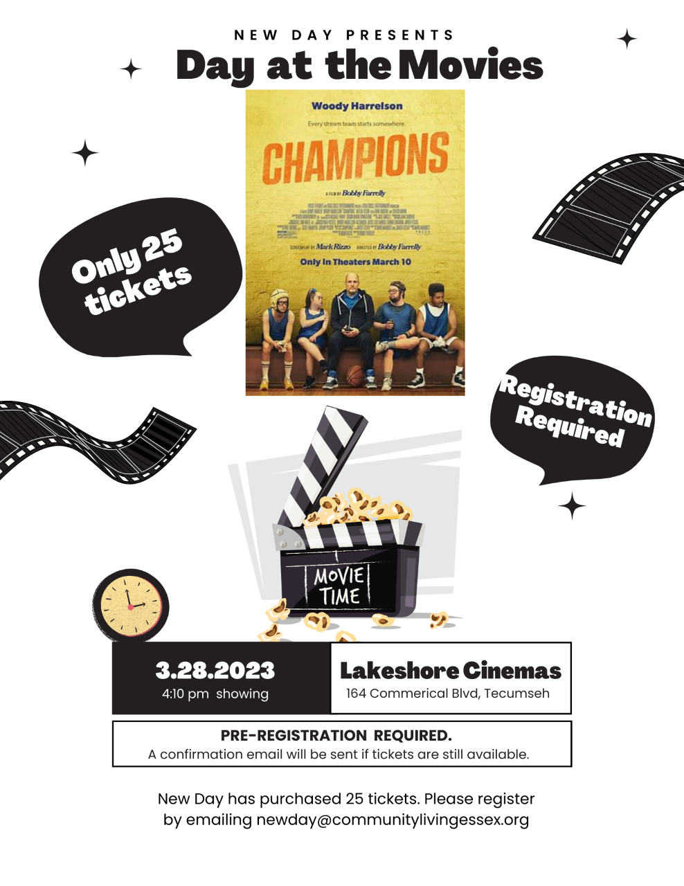 Join New Day Tuesday, March 28th for a day at the movies. Limited number of tickets available. Please email newday@communitylivingessex.org to reserve your ticket.