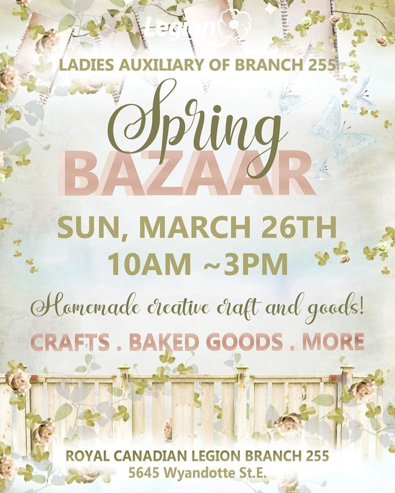 Are you looking for something to do this Sunday? Legion BR. 255 at 5645 Wyandotte Street E. is hosting a Spring Bazaar. Stop by between 10:00am-3:00pm to check out all the amazing local goodies!