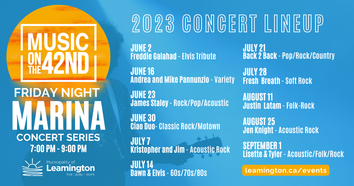 Enjoy Friday nights on the patio of Leamington Municipal Marina located at 90 Robson Rd., all summer long with FREE, live entertainment from great local musicians.