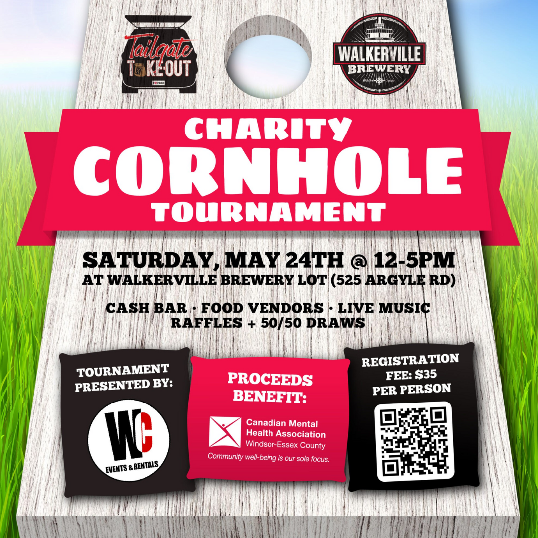 | The 3rd Annual Tailgate Takeout Charity Cornhole Tournament is set for Saturday, May 24th, from 12:00 p.m. to 5:00 p.m. at Walkerville Brewery. This fun-filled afternoon supports the Canadian Mental Health Association – Windsor Essex County and features a single-elimination, swap-style tournament run by Windsor Cornhole. Enjoy local brews, tasty eats from vendors, live music, raffles, and a 50/50 draw—all for a great cause. Entry is $35 per person, open to all skill levels, with cash prizes for the top three teams! Click the link below to purchase tickets. | |