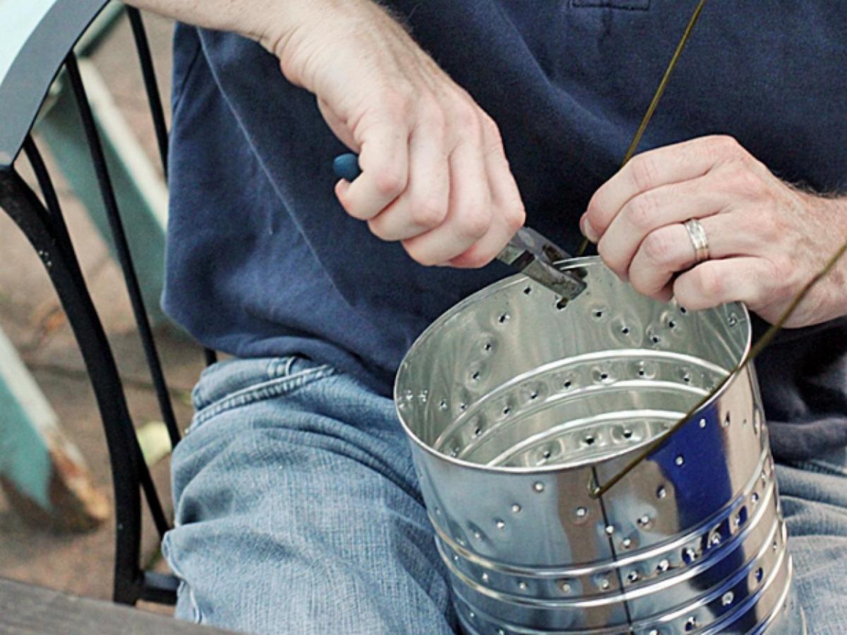 After you have poked enough holes, it is time to attach your handles. Clip your hangers and bend them into long loops. Hook the ends through holes in the cans and crimp them into hooks with your pliers. Be sure to make the handles long enough that the heat from the candles doesn't burn your hands.