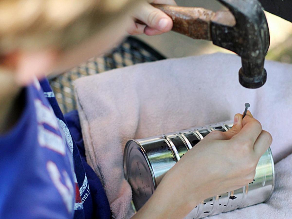 Next, find the most comfortable way to hammer nails into the can, poking holes where you’ve made marker dots. You can use a cordless drill to speed this step up, but it is not necessary. Remember, the more holes you poke, the more dramatic the lanterns will be.