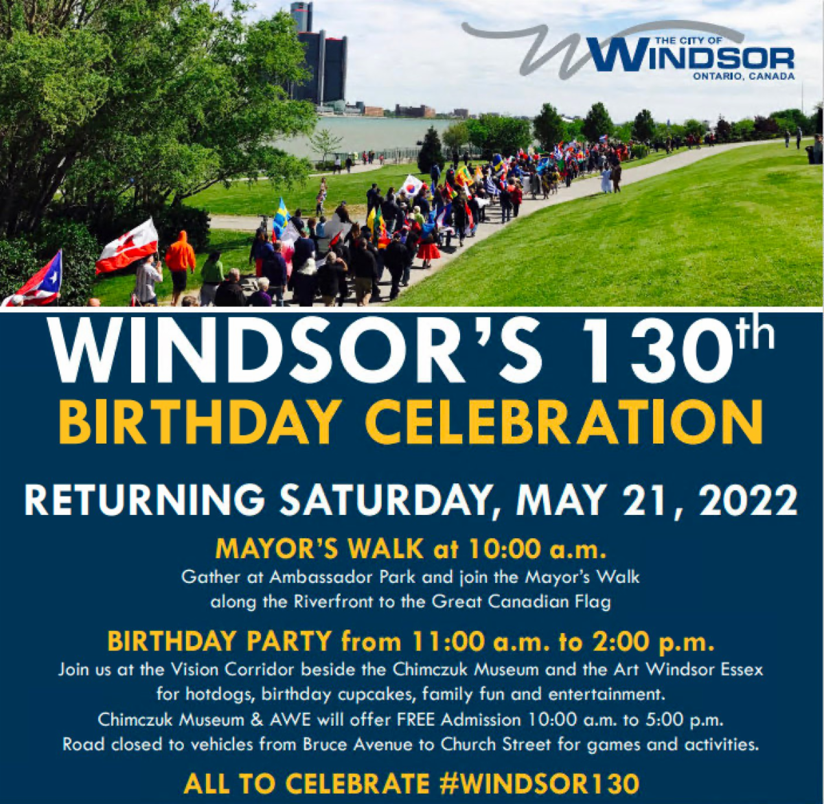 Windsor's birthday celebration will begin at 11:00 am at the Vision Corridor, 401 Riverside Drive West. Mayor Drew Dilkens will welcome the community to the annual birthday party at the Vision Corridor.