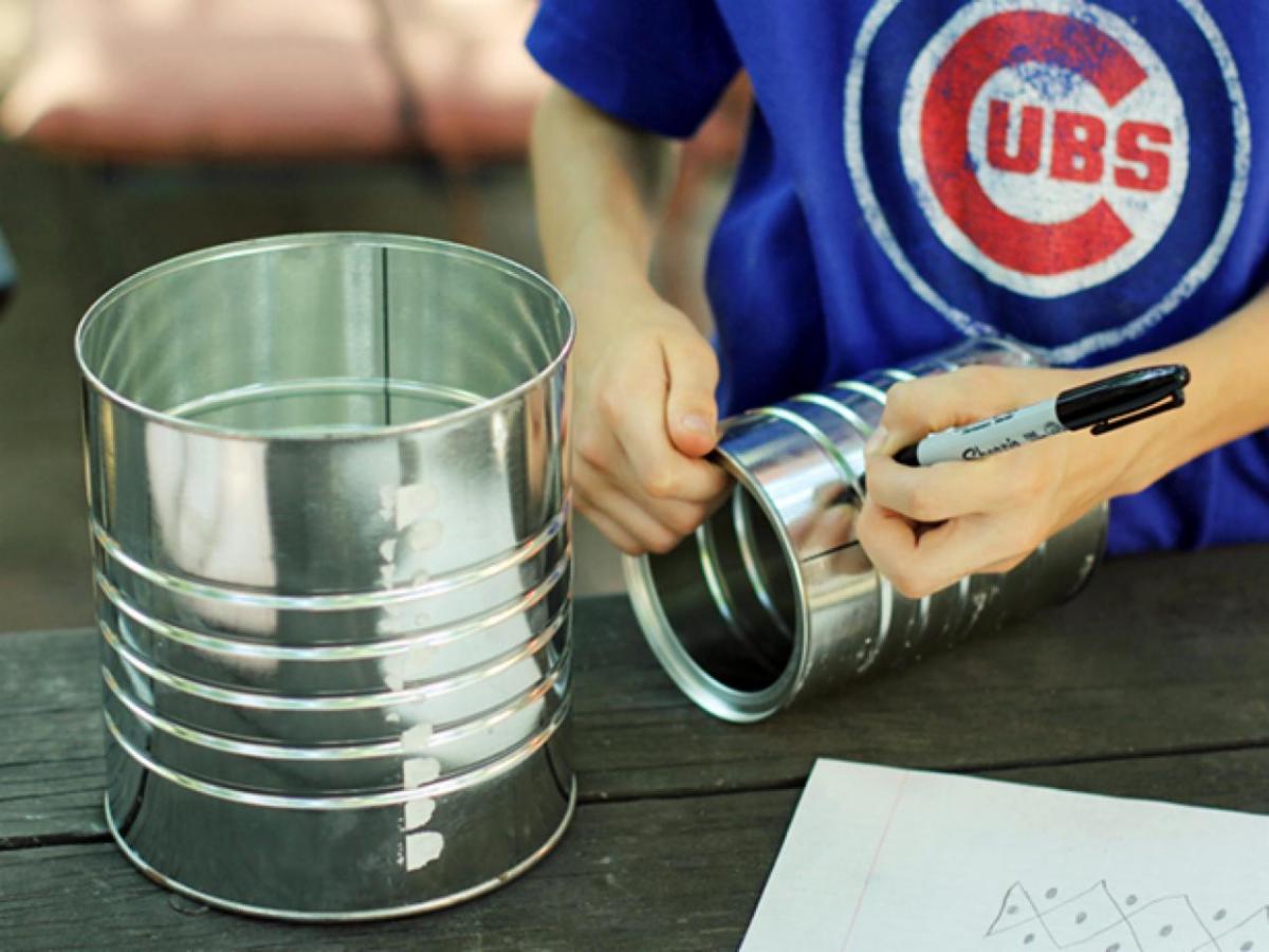 Tip: Cans that are a little thinner in width might bend a little when you're hammering in the nails in the next step. They'll still look and work fine in the dark but to avoid this, fill cans nearly full with water and freeze them overnight before you hammer them in the next step.