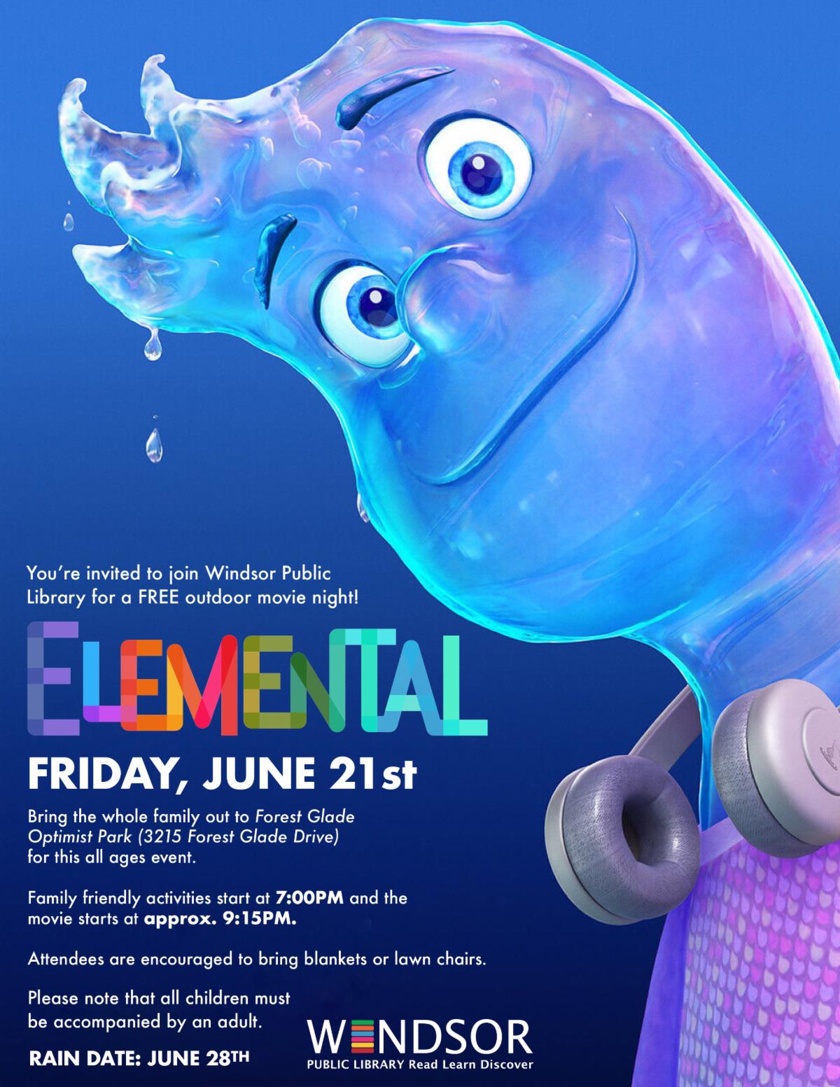 Join Windsor Public Library for a free all ages outdoor movie night at Forest Glade Optimist Park. The movie shown will be the Disney/Pixar animated movie, ‘Elemental’. Family-friendly activities start at 7:00p.m. and the movie begins at sundown (approximately 9:15p.m.). Concessions will be made available for purchase by the Forest Glade Optimist Club. Attendees are encouraged to bring blankets and lawn chairs. All children must be accompanied by an adult. | |