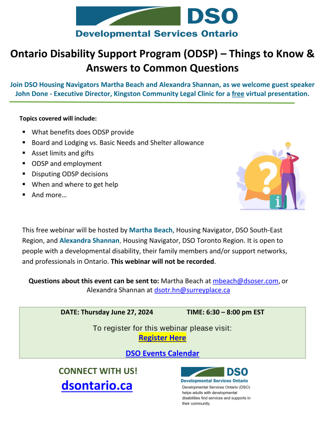 Developmental Services Ontario (DSO) is hosting a free virtual presentation on the Ontario Disability Support Program (ODSP) on June 27th from 6:30 p.m. to 8:00 p.m. This informative session will address common questions about ODSP, covering topics such as benefits, asset limits, employment, and disputing decisions. If you’re interested, you can register by clicking the button below | |