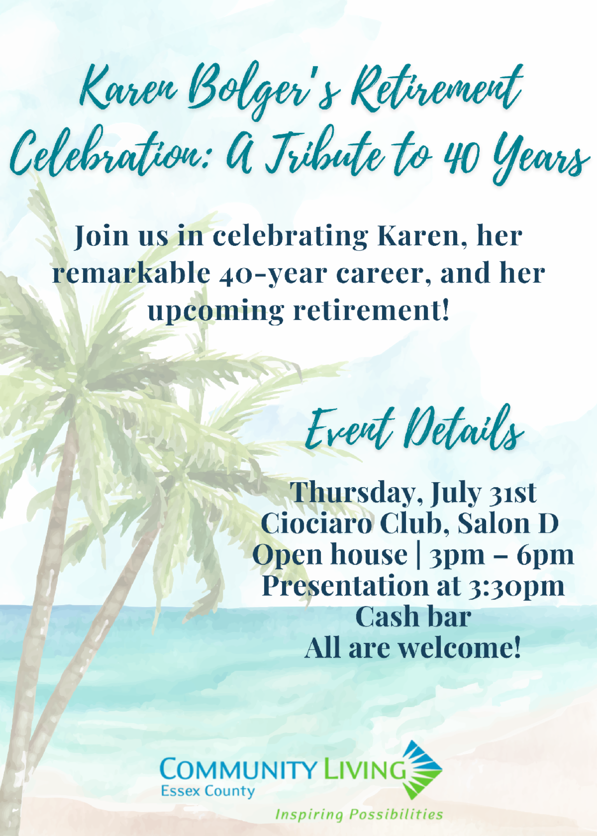 | | Essex Fun Fest & Sip 'n Shop Success: A Night of Fun, Food, and Community Support! | | We had a wonderful time at last week's Essex Fun Fest & Essex BIA's Sip 'n Shop Mixer! Live music, local wine, lots of vendors, awesome prizes and delicious charcuterie made for a great night! We are so happy to once again be the charity of choice for this event - $10 from each ticket sold was donated to Community Living Essex County! We are already looking forward to next year! | | You're Invited: A Tribute to Karen Bolger’s 40-Year Legacy | | |