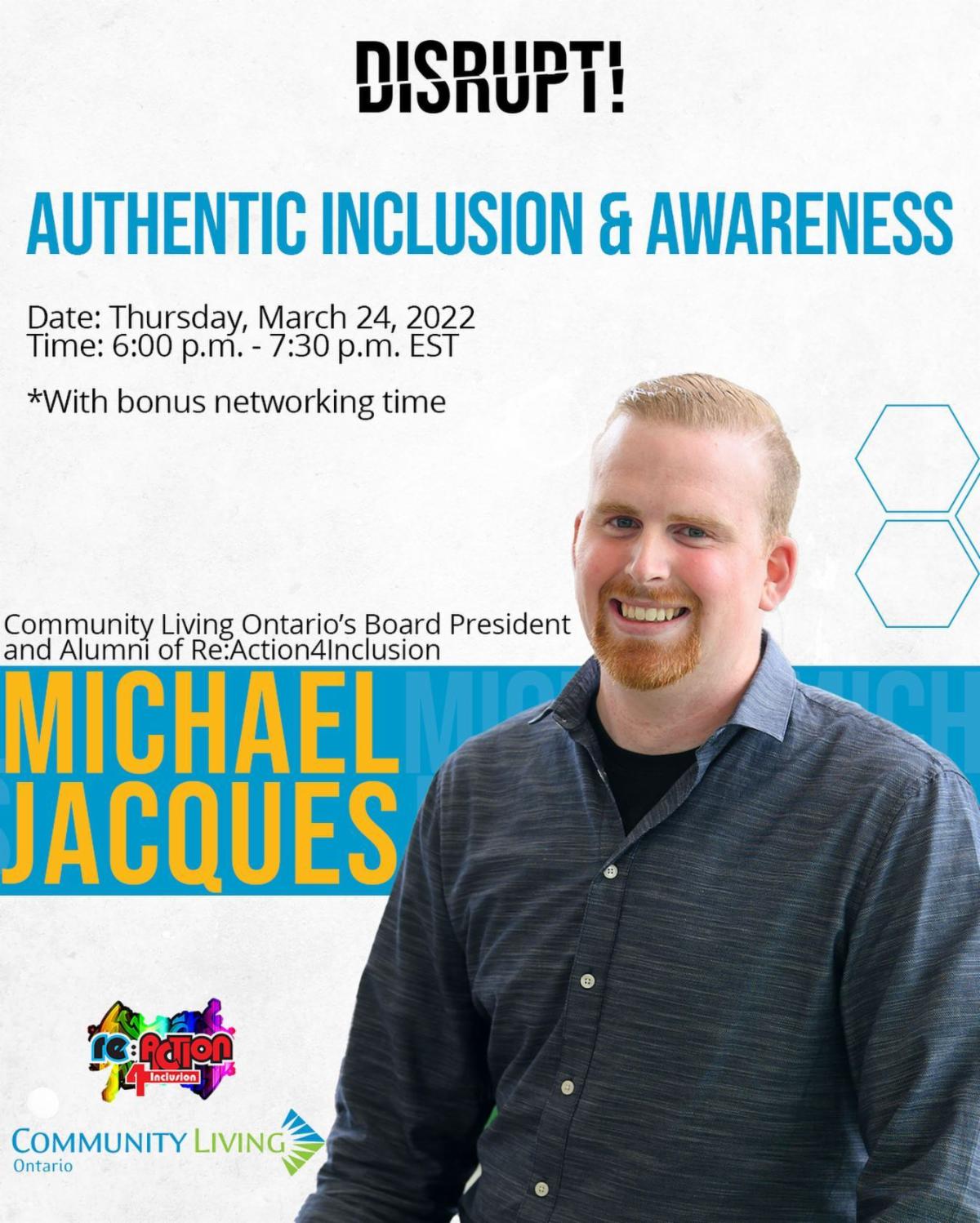 Michael Jacques, who never surrenders to the idea of “can’t,” will speak about topics such as learning, inclusion, advocacy, independence, and the power of perseverance. His journey with Re:Action4Inclusion started in Grade 10, where he found his voice as a participant. He then became involved with Re:Action4Inclusion as an organizer and since then has given numerous presentations promoting this fabulous youth movement. Michael’s insights and views on the world are equally challenging and inspiring. Through his witty and positive voice, Michael offers a glimpse of what it is like to be his authentic self.
