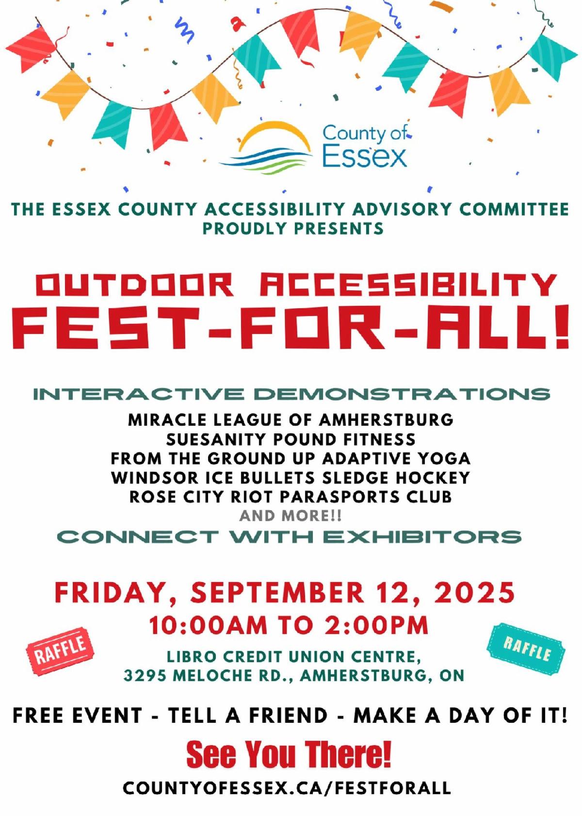 | Outdoor Accessibility Fest-For-All! | We're excited to once again be taking part in the second annual Outdoor Accessibility Fest-For-All! This event is hosted by the County of Essex's Essex County Accessibility Advisory Committee (ECAAC) and is taking place on Friday, September 12, from 10 a.m. to 2 p.m. at the Libro Credit Union Centre in Amherstburg. This is a free event, and all are welcome to attend. We hope to see you there! | |