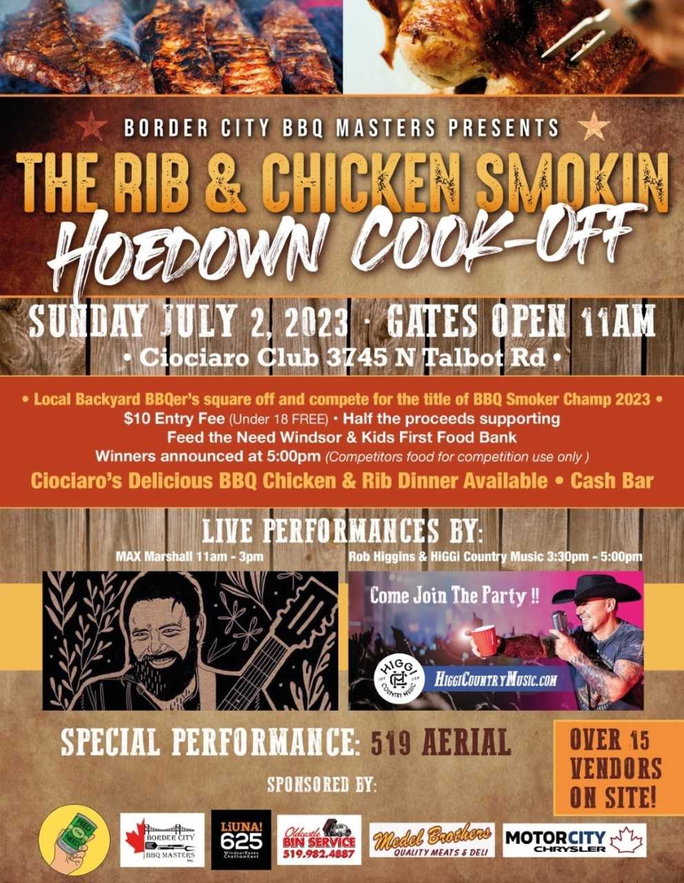 Local backyard BBQ teams square off for the title of BBQ Grand Champion for Chicken and Ribs 2023. There will be live music by Max Marshall and Higgi Country Band, local vendors, Ciociaro Club will be serving BBQ Ribs and Chicken to the public and a special performance by 519 Aerial.