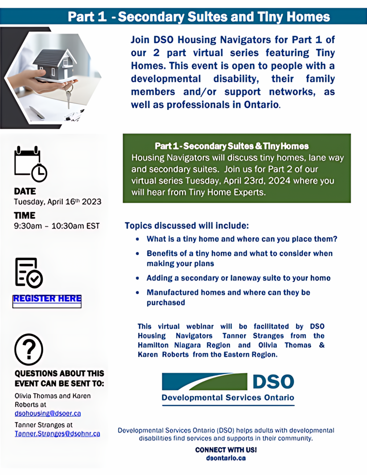 Upcoming DSO Virtual Presentations | Developmental Services Ontario is holding a free two-part virtual presentation about secondary suites and Tiny Homes. Part 1 will be taking place on April 16th, with Part 2 scheduled for April 23rd. Another free virtual presentation will be held on April 30. This presentation will give you an opportunity to learn about the DSO, its function, the application process and how to access Ministry funded services. Check out the flyers below for additional information and to register. | |