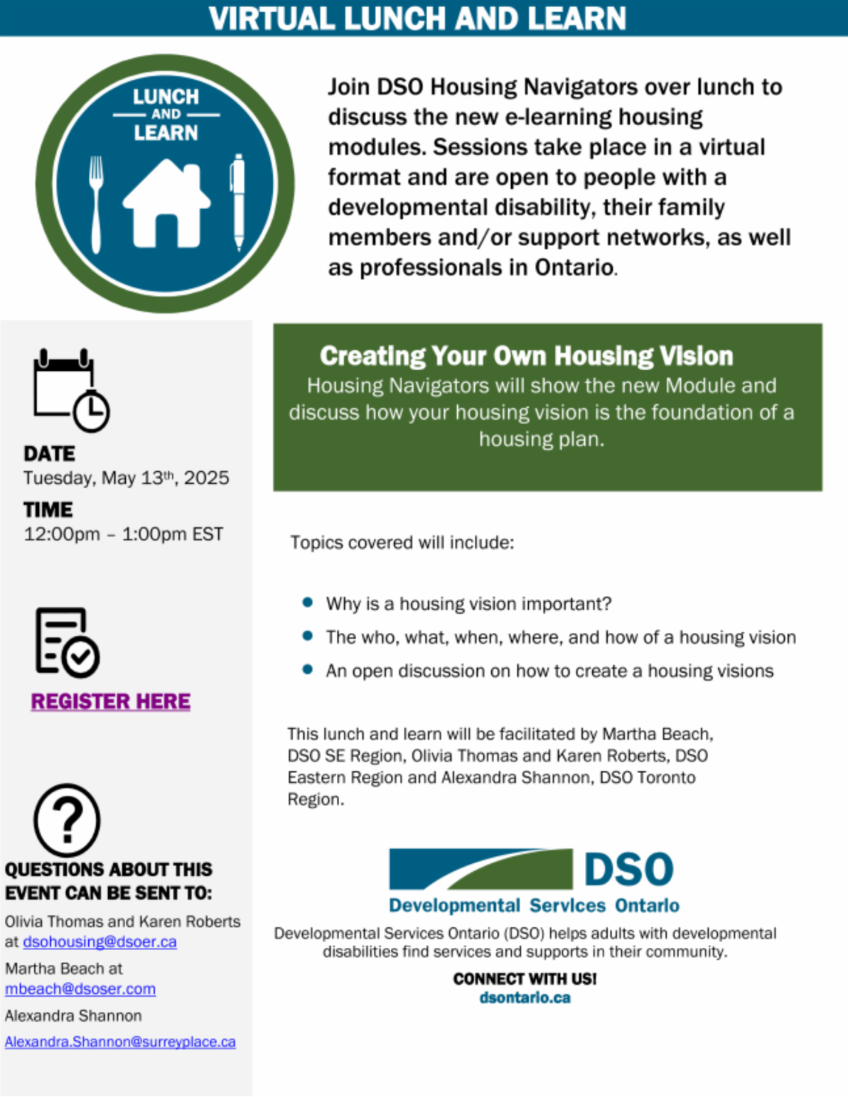 | | The Family Support Network for Employment (FSNE) invites families to join an upcoming informational webinar to prepare for the launch of their next free online course: Peer-to-Peer Knowledge Transfer: Framing the Pathway for Employment During the School Years. Grounded in the lived experiences of families supporting a loved one with an intellectual or developmental disability, the course helps parents and caregivers in Ontario gain valuable knowledge and advocacy tools to support their child's path from school to employment. During the webinar, participants will learn how to access and navigate the self-paced course and discover how FSNE’s guided online discussion groups will offer deeper exploration alongside other families. Two webinar sessions are available: Monday, May 12th at 7:00 p.m. and Wednesday, May 14th at 7:00 p.m. Click buttons below to register. | | DSO Webcast: Creating Your Own Housing Vision | | Join the DSO Housing Navigators for a Lunch and Learn event on Tuesday, May 13th, to explore the new e-learning housing modules designed to support individuals with developmental disabilities, their families, and support networks. This virtual session provides an opportunity to dive into housing resources and gain valuable insights. Whether you are a family member, a professional, or someone navigating housing options yourself, this event is open to all. It’s a free, informative hour from 12:00 p.m. to 1:00 p.m. Register by clicking the button below and start creating your own housing vision! | | P4P Webcast: Intro to the RDSP | The P4P Planning Network is offering a free online webcast about The Registered Disability Savings Plan (RDSP). This savings plan represents a unique Canadian initiative, offering a long-term savings option tailored for individuals living with disabilities. Key benefits include gaining insight into the RDSP and the potential for government contributions, staying informed on the most recent updates and modifications to the RDSP, learning tips and strategies, along with free resources for further information. The webcast is scheduled is scheduled to take place on Thursday, May 15th, at 2:00 p.m. Click the link below to register. | | |