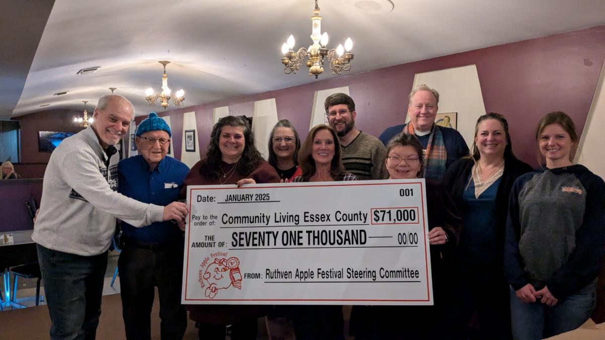 Members of the Ruthven Apple Festival Steering Committee were acknowledged for their contributions to the success of the 2024 festival at a recent cheque presentation event. Despite the wet and rainy conditions during the 2024 Ruthven Apple Festival held back in late September, we are thrilled to announce that a cheque for $71,000 was presented by committee members to Community Living Essex County.