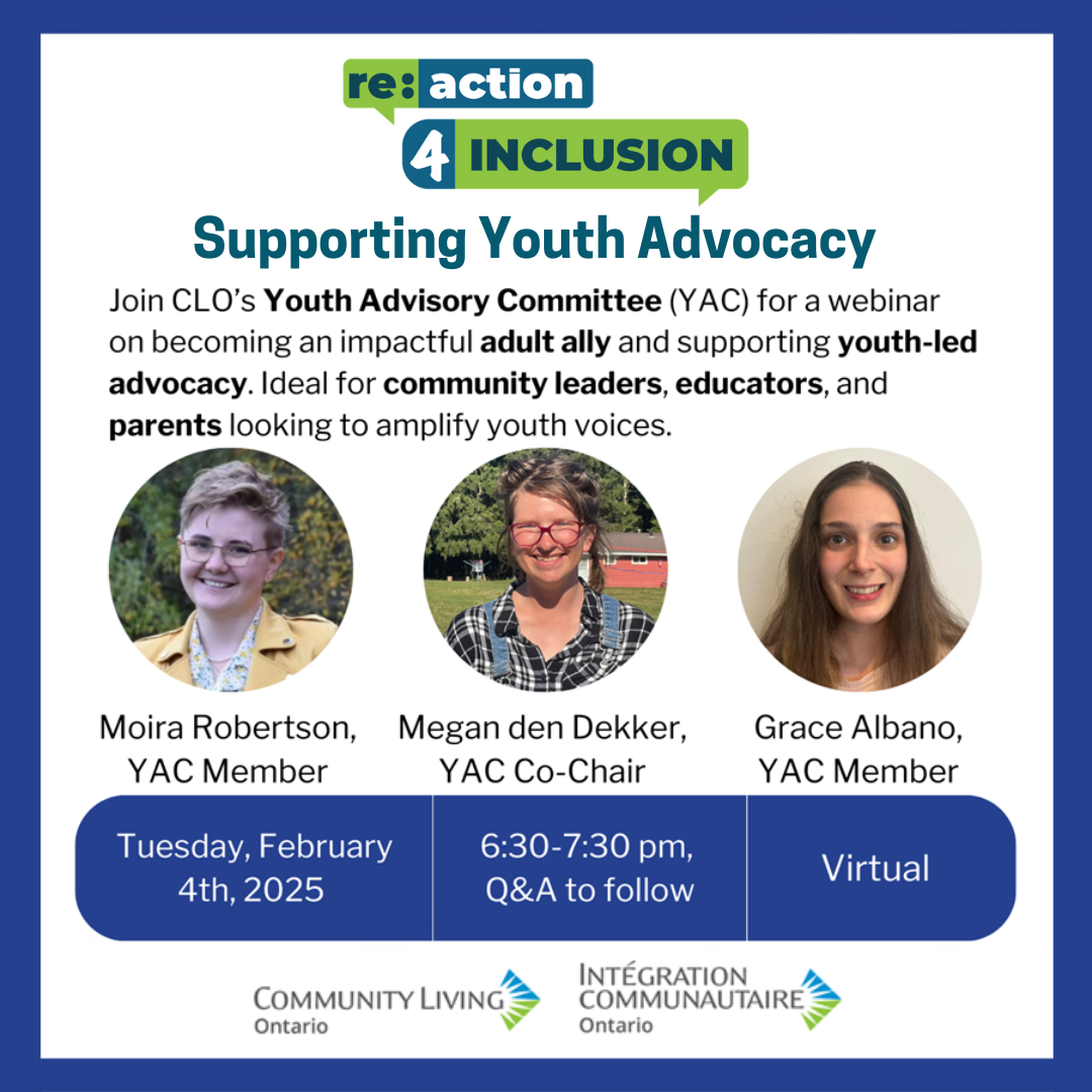 Join Community Living Ontario’s Re:Action4Inclusion (R4I) for the Supporting Youth Advocacy Webinar on Tuesday, February 4th, from 6:30 p.m. to 7:30 p.m. Learn how R4I’s Youth Advisory Committee (YAC), a group of changemakers aged 13-29, is leading disability advocacy in Ontario, driving social change, and fostering inclusive communities. This session will explore how adults can support youth-led initiatives, promote inclusion, and inspire future leaders. Ideal for community leaders, educators, and parents, the webinar offers practical tools to amplify youth voices and create meaningful impact. Click the button below to register. | |