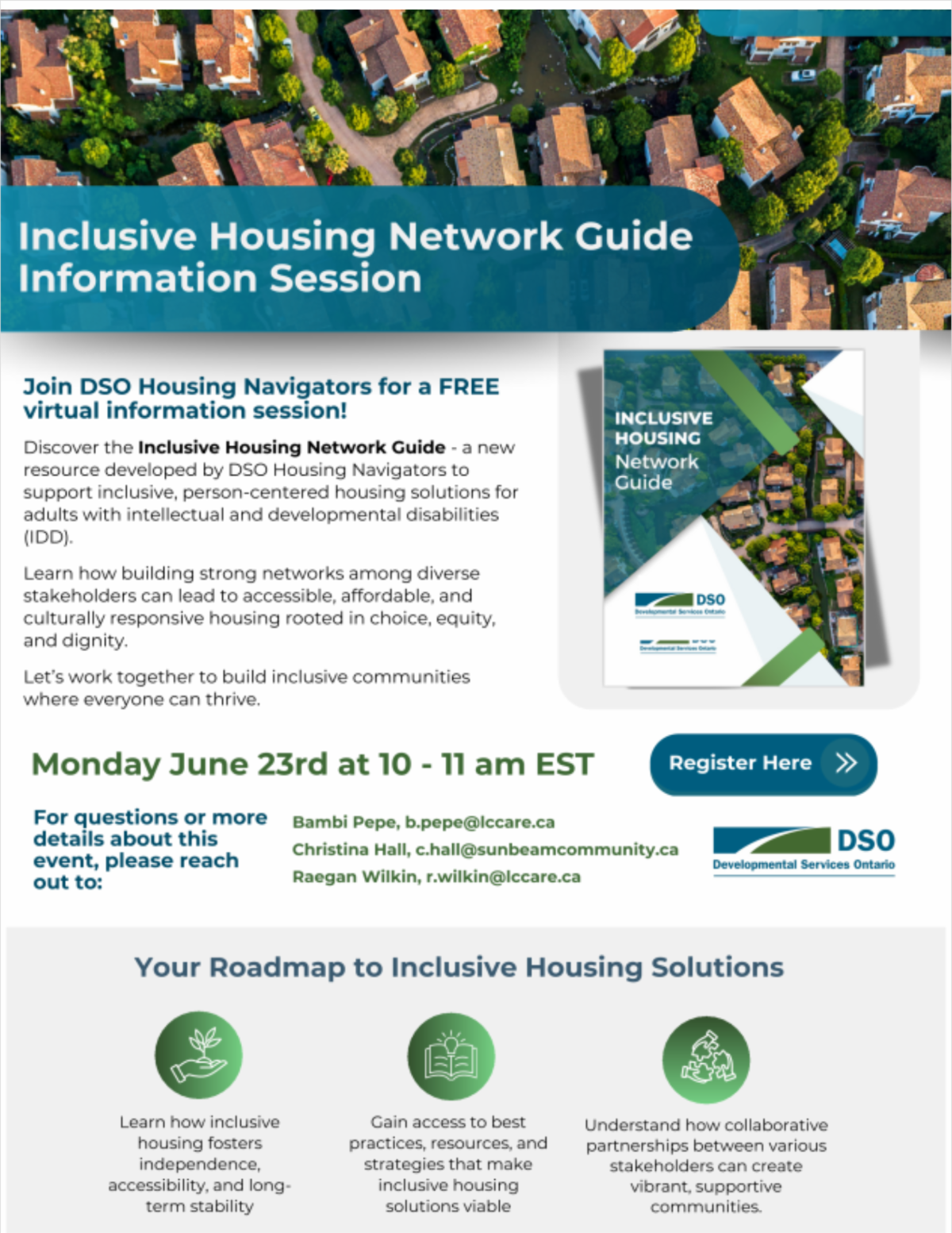 | | P4P is hosting a virtual bilingual (French/English) presentation on Tuesday, June 24, at 7:00 p.m. about Journey to Belonging: Choice and Inclusion, the Government of Ontario’s plan to reform developmental services. This plan centers on a vision where people with developmental disabilities are supported by their communities, support networks, and government to belong and live inclusive lives, empowered to make choices and live as independently as possible. The presentation will include updates on key commitments such as the development of a new needs-based funding approach. Following the webcast, there will be a live Q&A session with MCCSS Directors Christine Kuepfer and Amy Olmstead. Click the button below to register for this informative session. | | DSO Webcast: Inclusive Housing Network Guide Information Session | | On June 23rd, join a virtual information session on the Inclusive Housing Network Guide, a new resource developed by DSO Housing Navigators to support inclusive, person-centered housing solutions for adults with intellectual and developmental disabilities (IDD). Participants will learn how building strong networks among diverse stakeholders can lead to accessible, affordable, and culturally responsive housing rooted in choice, equity, and dignity. The session will run from 10:00 a.m. to 11:00 a.m., with a meeting link provided prior to the event. Click the button below to register. | |
