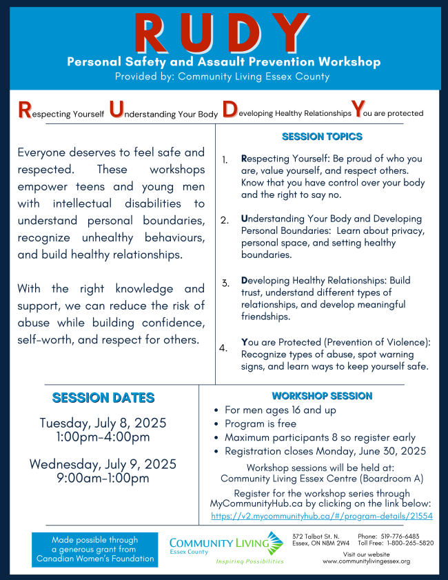 Community Living Essex County is offering a free in-person workshop for teens and young men with intellectual disabilities, with two sessions taking place on Tuesday, July 8th from 1:00 p.m. to 4:00 p.m. and Wednesday, July 9th from 9:00 a.m. to 1:00 p.m. The workshop will cover personal boundaries, self-respect, healthy relationships, and recognizing different types of assault and violence. It’s open to men aged 16 and up, with only 8 spots available, so be sure to register early before the June 30th deadline. To sign up, click the flyer or use the button below to register on My Community Hub.