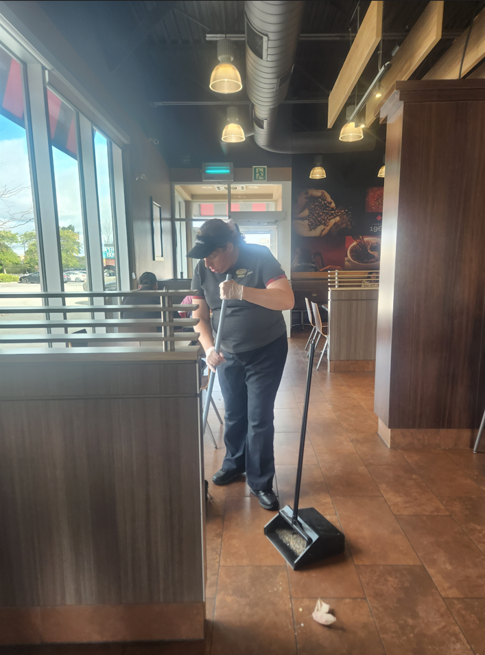 Meet Emily! She's been a part of the Tim Horton's team for quite a few years. Emily's job involves keeping the tables clean and making sure everything is nice and organized. But there's more to her work than what you see in the dining area. Behind the scenes, Emily works hard washing dishes, making sure the washrooms are spick and span, and even taking out the trash. She's a crucial part of the team, making sure this location is clean and tidy for everyone to enjoy. Kudos to Emily for her dedication to keeping Tim Horton's a clean and welcoming spot!