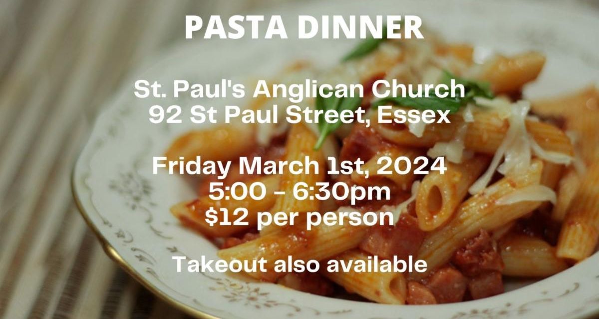 Stop by St. Paul's Anglican Church, located at 92 St. Paul Street in Essex, on Friday, March 1 between 5pm-6:30pm for a delicious pasta dinner. $12 dinners include the option of meat or veggie pasta with salad, roll, drink and dessert. Take out is also available. | |