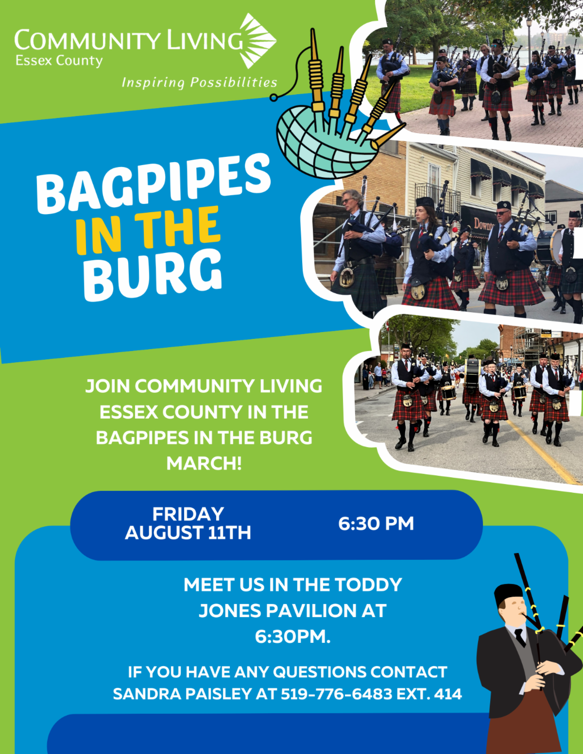 Bagpipes in the Burg is a group that performs every Friday evening during the Amherstburg Open Streets. Each week they invite a different community group, club, sports team or organization to join them . This week, they have invited various community service organizations, including Community Living Essex County, to march with them! If you'd like to take part, check out the flyer above for event details, or call Sandra at 519-776-6483 extension 414.