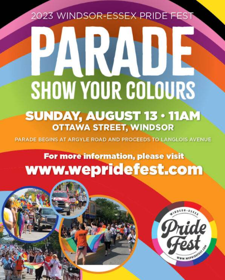 The 31st Windsor-Essex Pride Festival will conclude with it's annual parade on Sunday August 13th, at 11:00 am. The parade will begin at Argyle Road (Market Square) and will proceed down Ottawa Street to Lanspeary Park. This event focuses on bringing all different segments and groups together to celebrate the 2SLGBTQIA+ community and it's accomplishments while raising awareness of ongoing challenges including discrimination, exclusion, harassment, and assault. Click the link below to access the full event page with all activity dates and times.