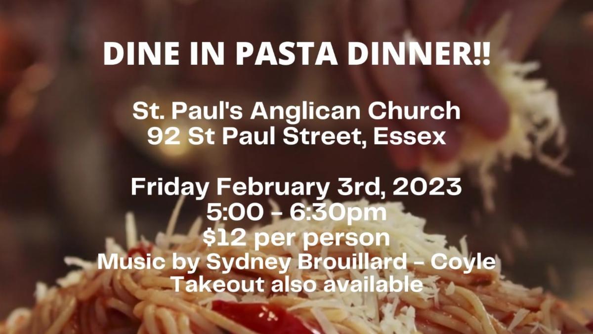 St. Paul's Anglican Church in Essex is hosting a pasta dinner on February 3rd from 5:00 - 6:30 pm. Cost is $12 and there is a vegetarian option available.