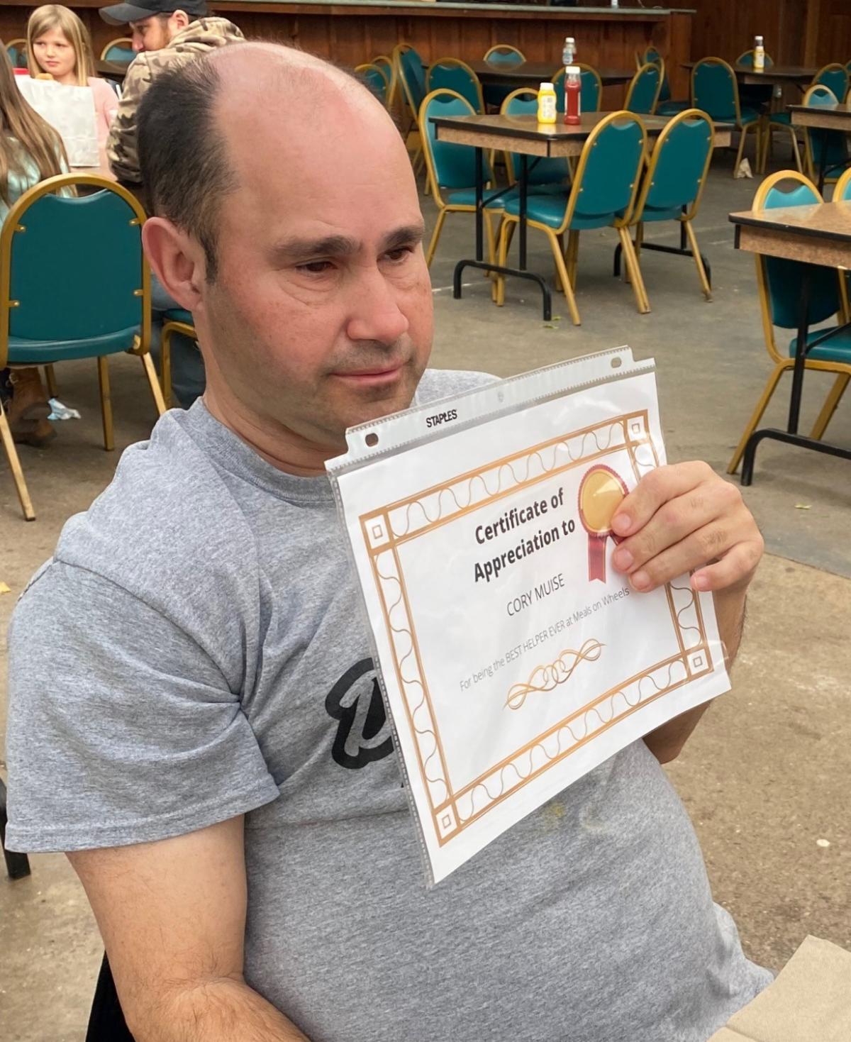 Over the past 18 years, Cory has volunteered twice a week with Meals on Wheels in his community of Leamington. Cory takes great pride in this responsibility and recognizes the importance of these weekly deliveries. He loves sharing with others how much he enjoys these responsibilities. On March 4th Cory attended a celebratory lunch at Colasanti's where he was presented with a certificate of appreciation for all of his hard work and commitment to Meals on Wheels. He proudly shows off his certificate and displays it in his home.