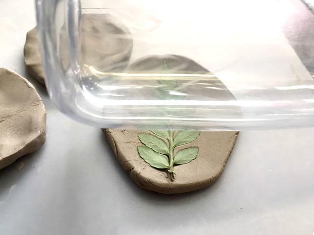 - Place a bit of plant or flower onto the clay and roll over it gently with a smooth water bottle or rolling pin.