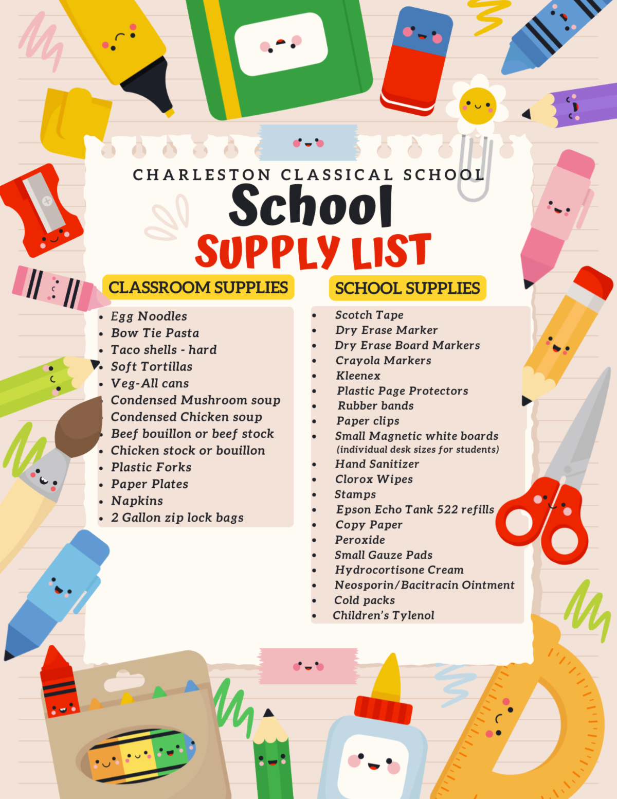 Please bring supplies through March to help Charleston Classical School prepare daily lunch for their students. They also have other school supply needs. Place your items on the table by the