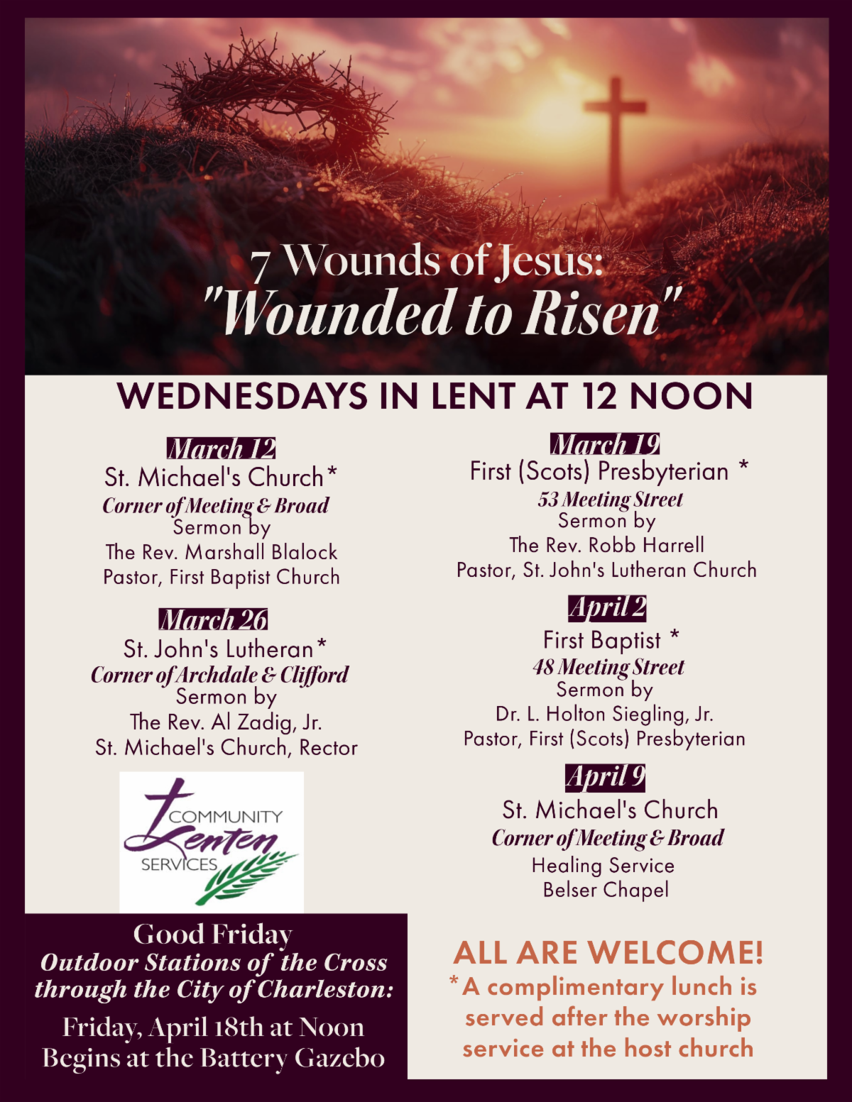 This week's Community Lenten Service will be at First (Scots) Presbyterian Church, The Rev. Robb Harrell from St. Johns Lutheran Church will be preaching. Lunch will be served following the service. All are welcome!