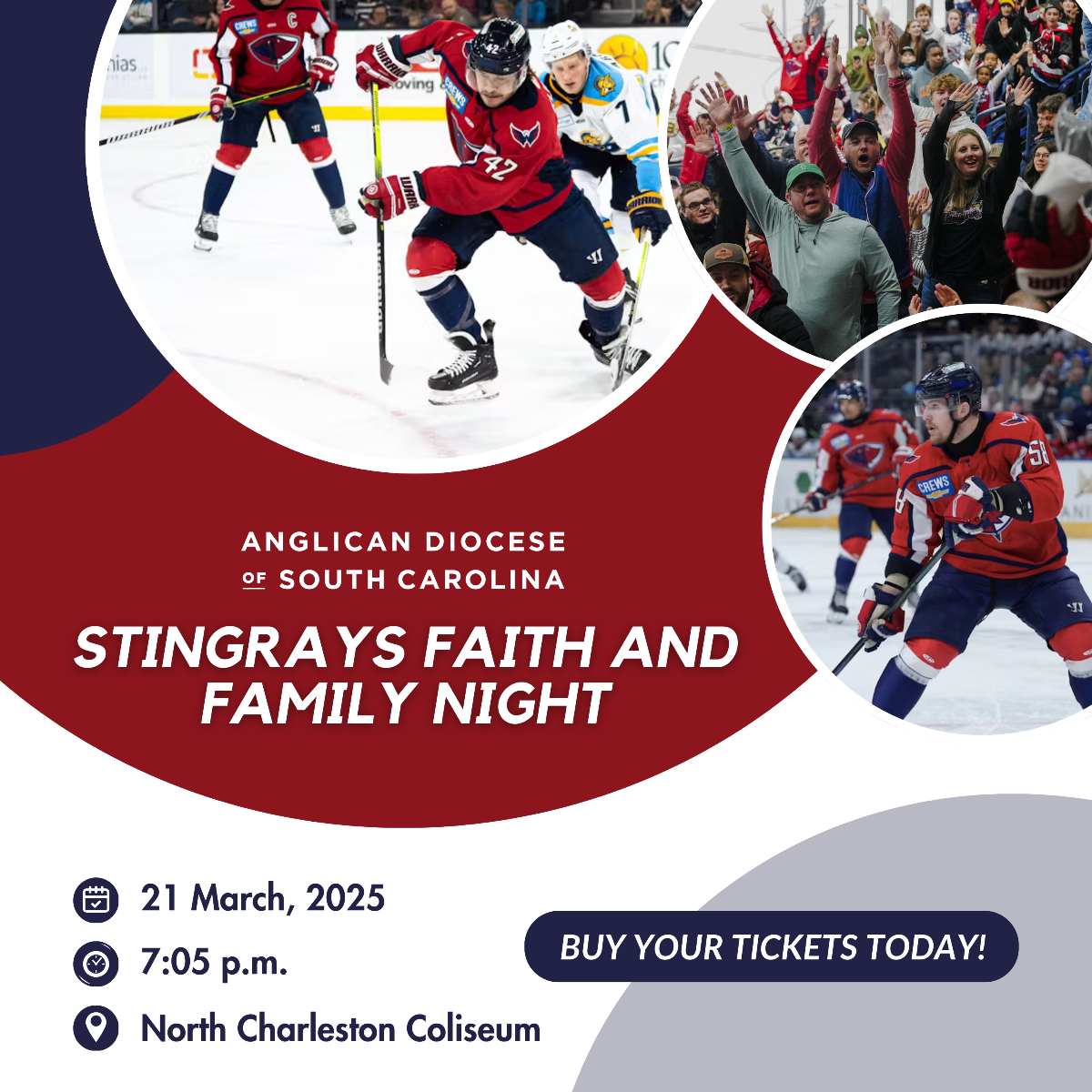 Don't miss the very first ADOSC Stingrays Faith and Family Night on March 21! Join the Bishop Edgar and The Anglican Diocese of South Carolina at the North Charleston Coliseum to enjoy a Stingrays Hockey game! The game begins at 7:05 p.m. Buy your tickets today!