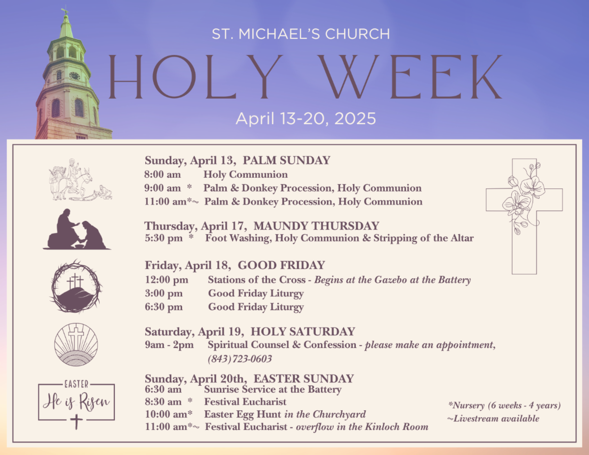 - Good Friday Services, Stations of the Cross (Battery) April 18, 12pm, 3pm and 6:30pm