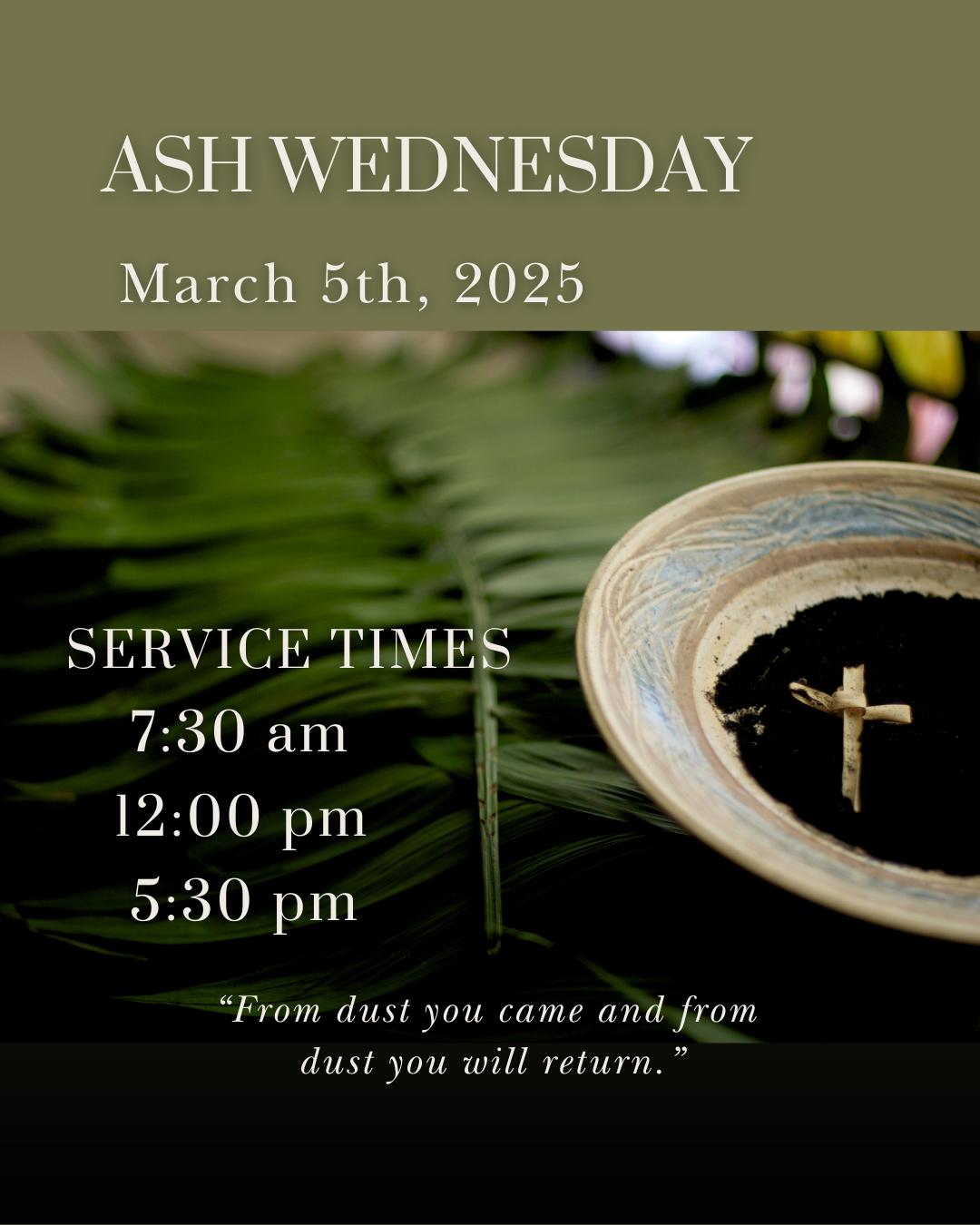 - Ash Wednesday Services, March 5th, 7:30 am, 12 pm, 5:30 pm