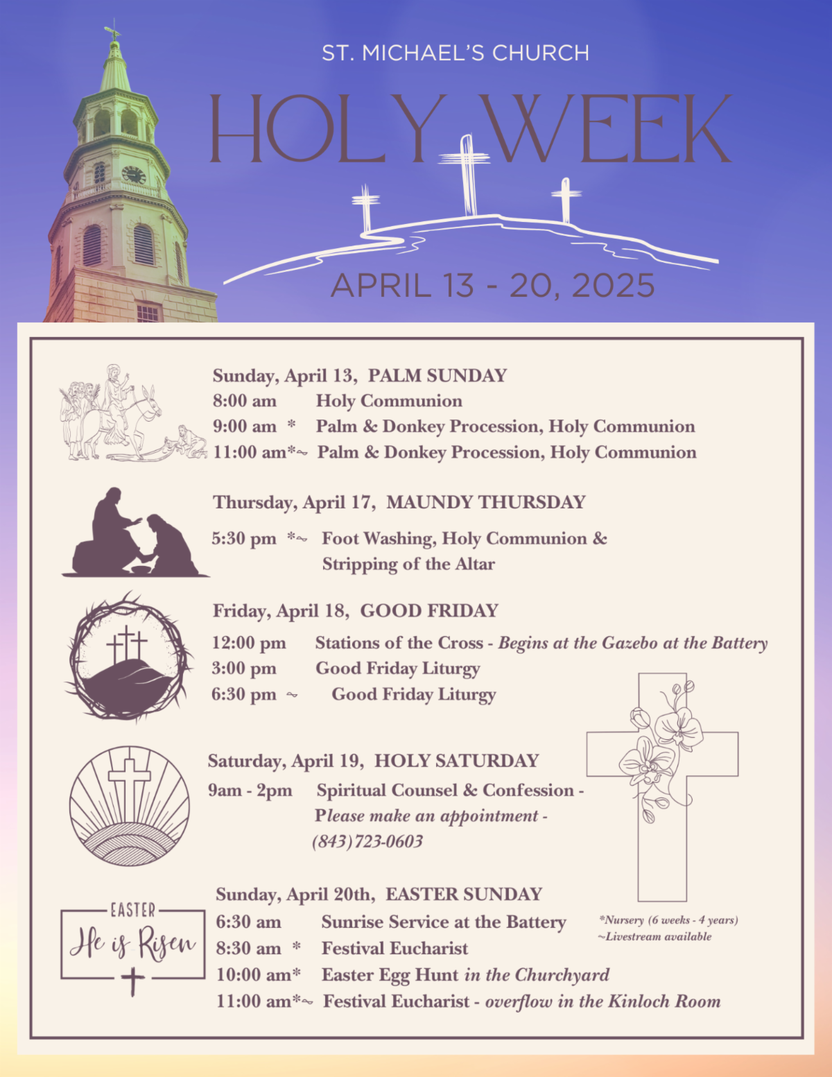 - Good Friday Services, Stations of the Cross (Battery) April 18, 12pm, 3pm and 6:30pm