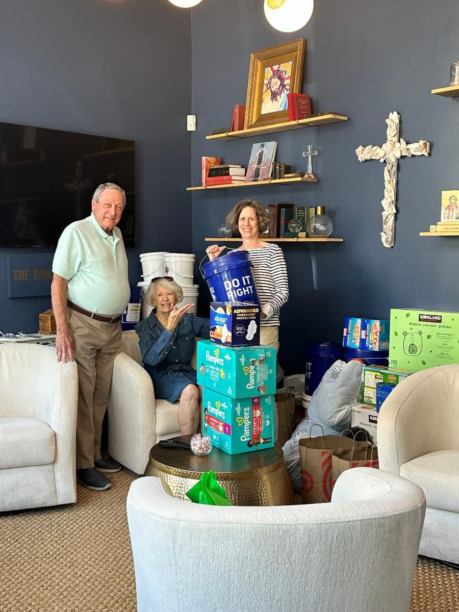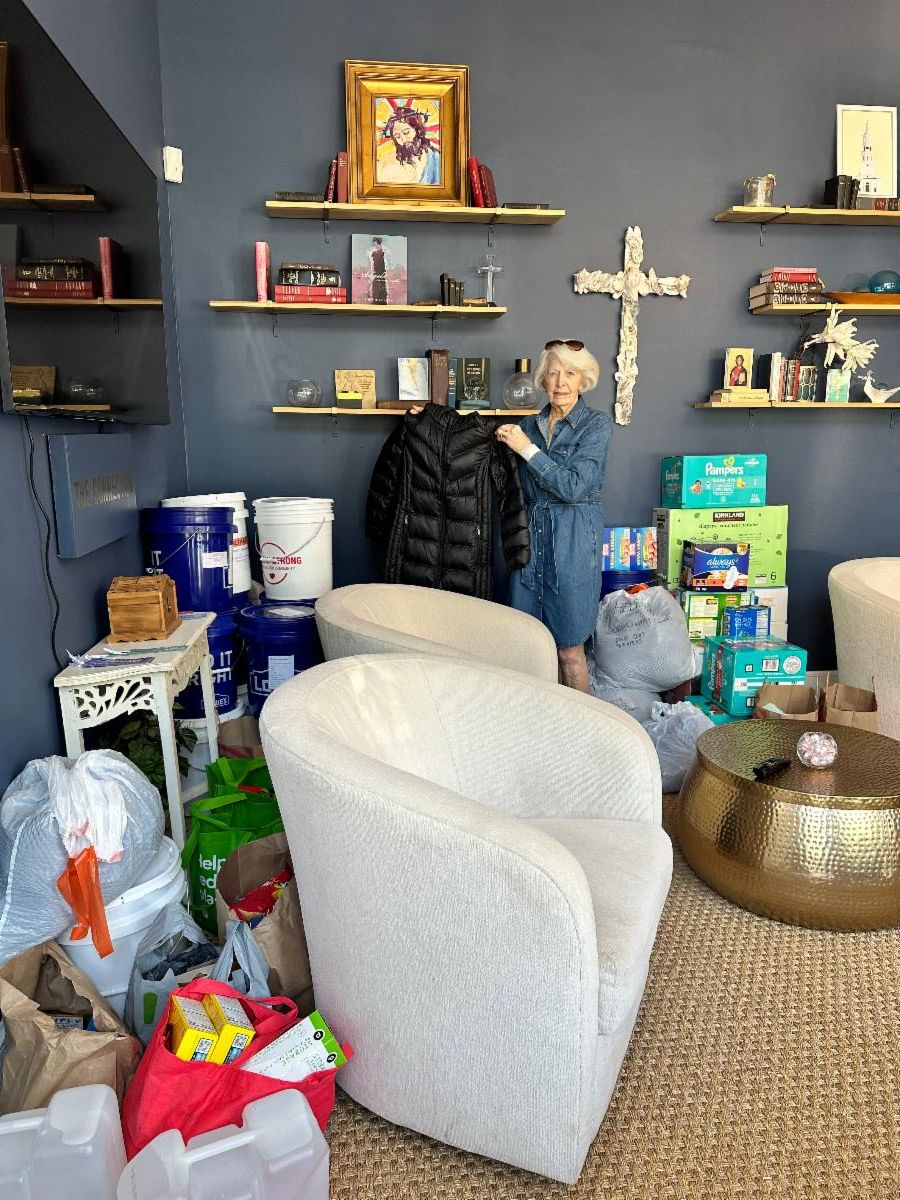 Donations have been steadily coming in! See pictures below of Jean and Johnny Corbett and Susan Waring in the Connection Room. There is an urgent need for new or gently used/clean winter clothing items such as coats, hats, sweaters, and scarfs, feminine hygiene products and baby items (baby formula, wipes, diapers and onesies.). Thank you!